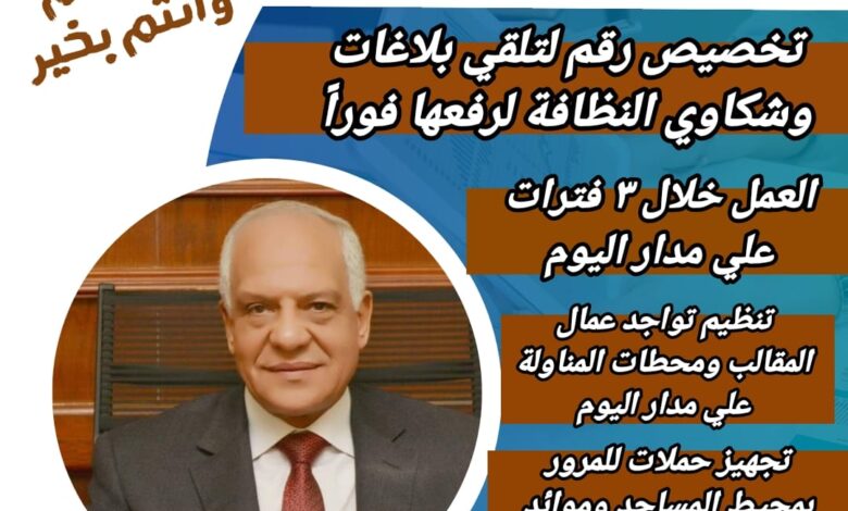 واشار محافظ الجيزة انه تم تكليف فرق للنظافة بكل حي للتواجد والمروى الدوري بمحيط المساجد وموائد الرحمن ودور المناسبات لمتابعه حالة النظافة ورفع اي مخلفات أولا بأول الي جانب وضع خطه عمل لسيارات الكنس الالي لرفع كفاءة الشوارع الرئيسية والمحاور المرورية.