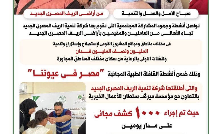 وأكد اللواء عمرو عبد الوهاب، رئيس مجلس الإدارة والعضو المنتدب لشركة تنمية الريف المصرى الجديد، أن الشركة حريصة على تعزيز دورها المجتمعى داخل مناطق المشروع القومى، قائلاً : “إن ما نقوم به ليس مجرد نشاط خيرى، بل هو جزء أساسى من رؤية الشركة لبناء مجتمع متكامل يتمتع بخدمات صحية وتنموية حقيقية.”
