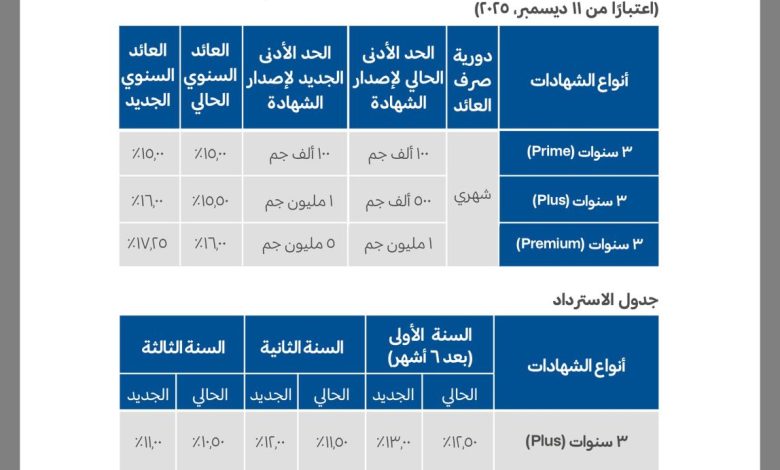 شهادات الادخار 3 سنوات ذات العائد الثابت بالجنيه المصري اعتبارا من 11 ديسمبر 2025