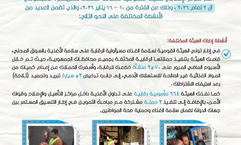 أصدر المركز الإعلامي للهيئة القومية لسلامة الغذاء تقريره الأسبوعي الثاني لعام 2026، وذلك عن الفترة من 10 – 16 يناير 2026، والذي تضمن العديد من الأنشطة المختلفة على النحو التالي: