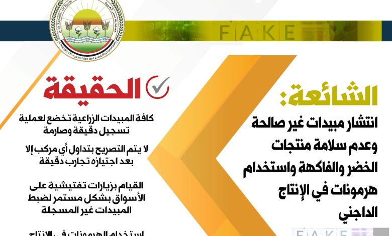 وفي إطار حرص الوزارة على توضيح الحقائق للرأي العام، تؤكد الوزارة أن كافة المبيدات الزراعية المتداولة في الأسواق تخضع لعملية تسجيل دقيقة وصارمة من قبل “لجنة مبيدات الآفات الزراعية”، وهي لجنة تضم نخبة من العلماء والخبراء. ولا يتم التصريح بتداول أي مركب إلا بعد اجتيازه تجارب حقلية وتحليلات معملية دقيقة لضمان مطابقته للمعايير الدولية الصادرة عن منظمة الأغذية والزراعة (FAO) ومنظمة الصحة العالمية (WHO).