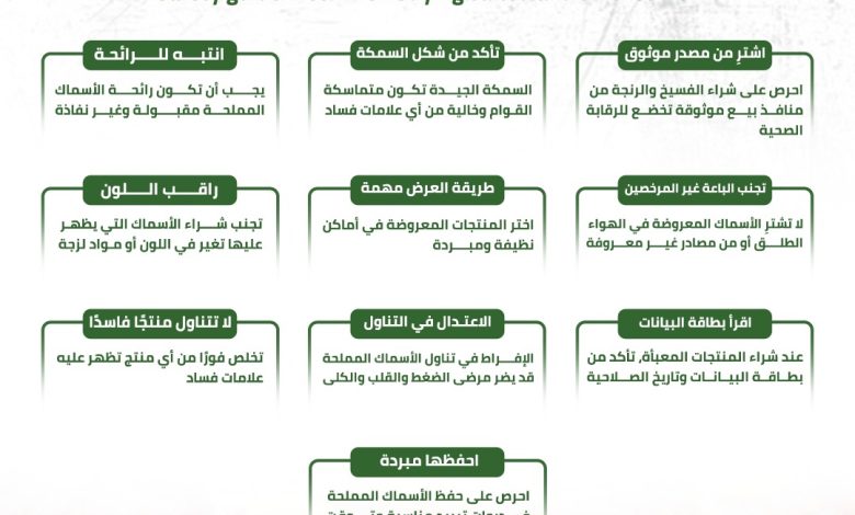 كما نصحت الهيئة المستهلكين بضرورة التخلص من أي منتج تظهر عليه علامات فساد، وعدم المجازفة بتناوله، مع الحرص على حفظ الأسماك المملحة في درجات تبريد مناسبة حتى وقت الاستهلاك.