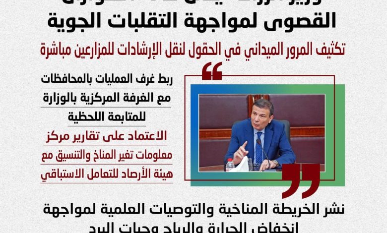 وتأتي هذه الإجراءات استناداً إلى التقارير والتوصيات الفنية الصادرة عن مركز معلومات تغير المناخ بمركز البحوث الزراعية، وبالتنسيق مع الهيئة العامة للأرصاد الجوية، لضمان التعامل الاستباقي مع التغيرات المناخية الاستثنائية.