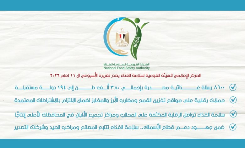 أصدر المركز الإعلامي للهيئة القومية لسلامة الغذاء تقريره الأسبوعي الـ 11 لعام 2026، وذلك عن الفترة من 14 – 27 مارس 2026، والذي تضمن العديد من الأنشطة المختلفة على النحو التالي: