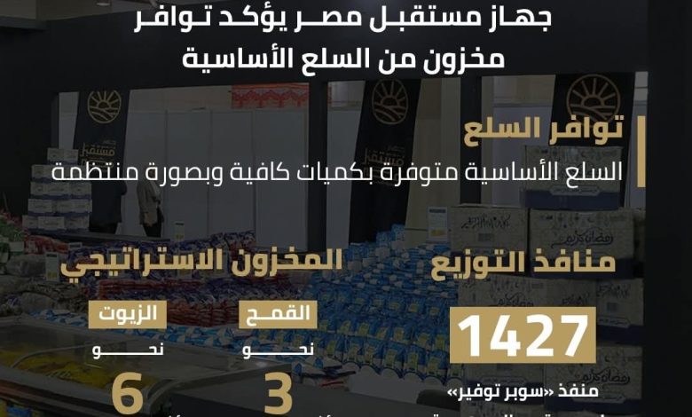 وأشار إلى أن توافر السلع الأساسية يتم بكميات كافية وبصورة منتظمة عبر شبكة منافذ الجهاز «سوبر توفير»، والتي يبلغ عددها 1427 منفذًا، مع وجود مخزون استراتيجي آمن، حيث يصل مخزون السلع الاستراتيجية إلى عدة أشهر، بما يسهم في تعزيز قدرة الدولة على ضبط الأسواق وتوفير السلع للمواطنين بأسعار مناسبة.
