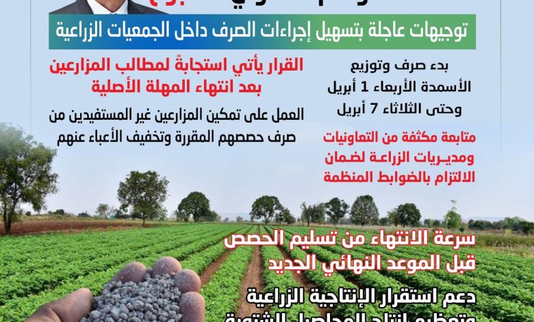 عاجل.. وزير الزراعة يقرر مد فترة صرف أسمدة الموسم الشتوي لمدة أسبوع ينتهي في 7 ابريل المقبل
