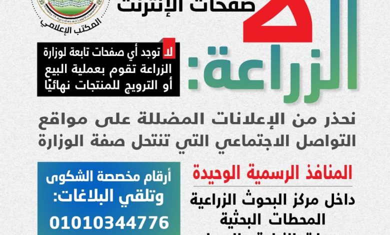 وتؤكد وزارة الزراعة بشكل قاطع أنه لا توجد أي صفحات رسمية تابعة لها أو لأي من قطاعاتها تقوم بعملية البيع أو الترويج للمنتجات نهائيًا عبر الإنترنت.
